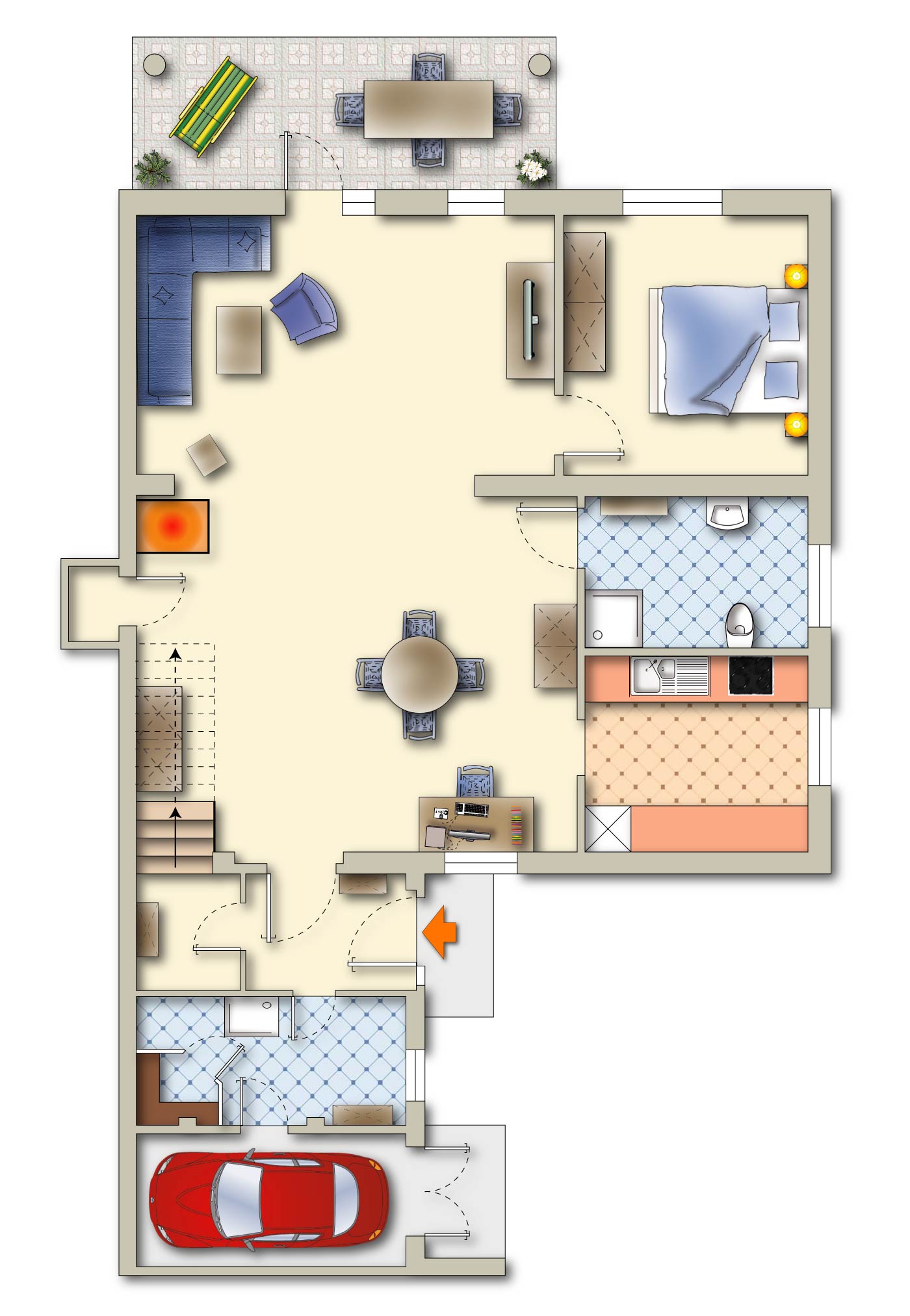 Die Hauptwohnung im Erdgeschoss mit einer Wohnfläche von 82 qm heißt Sie mit einem großzügig gestalteten Wohnbereich willkommen. Ein Kamin schafft hier eine behagliche Atmosphäre und lädt zu gemütlichen Stunden ein. Vom Wohnzimmer aus gelangen Sie direkt auf die überdachte Terrasse, die einen wunderbaren Rückzugsort für entspannte Momente bietet. Eine stilvolle Küche, ein ruhiges Schlafzimmer, ein Duschbad und ein Flur komplettieren diese Etage. Die Privatsphäre der aktuellen Bewohner ist uns wichtig, weshalb wir auf Fotos im Erdgeschoss verzichtet haben. Bei einer persönlichen Besichtigung laden wir Sie jedoch herzlich ein, sich selbst ein Bild zu machen.