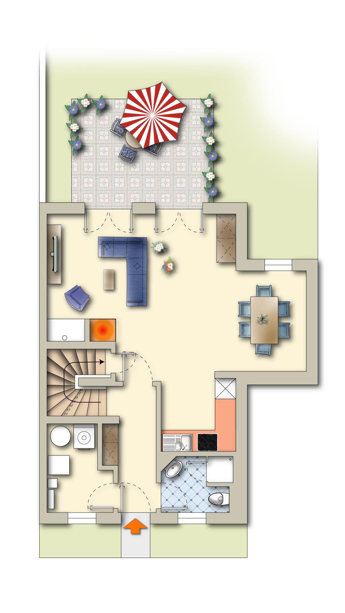 Das Erdgeschoss: Lichtdurchflutete Geselligkeit Schon beim Betreten des Hauses empfängt Sie eine Atmosphäre von Klarheit und Wärme. Der einladende Eingangsbereich leitet Sie direkt in das Herzstück des Hauses: den großzügigen Wohn- und Essbereich. Bodentiefe Fensterflächen lassen das Tageslicht fluten und schaffen eine fließende Verbindung zur sonnigen Süd-West-Terrasse – der perfekte Ort für ein ausgiebiges Frühstück im Freien oder einen Sundowner nach einem Tag am Meer.