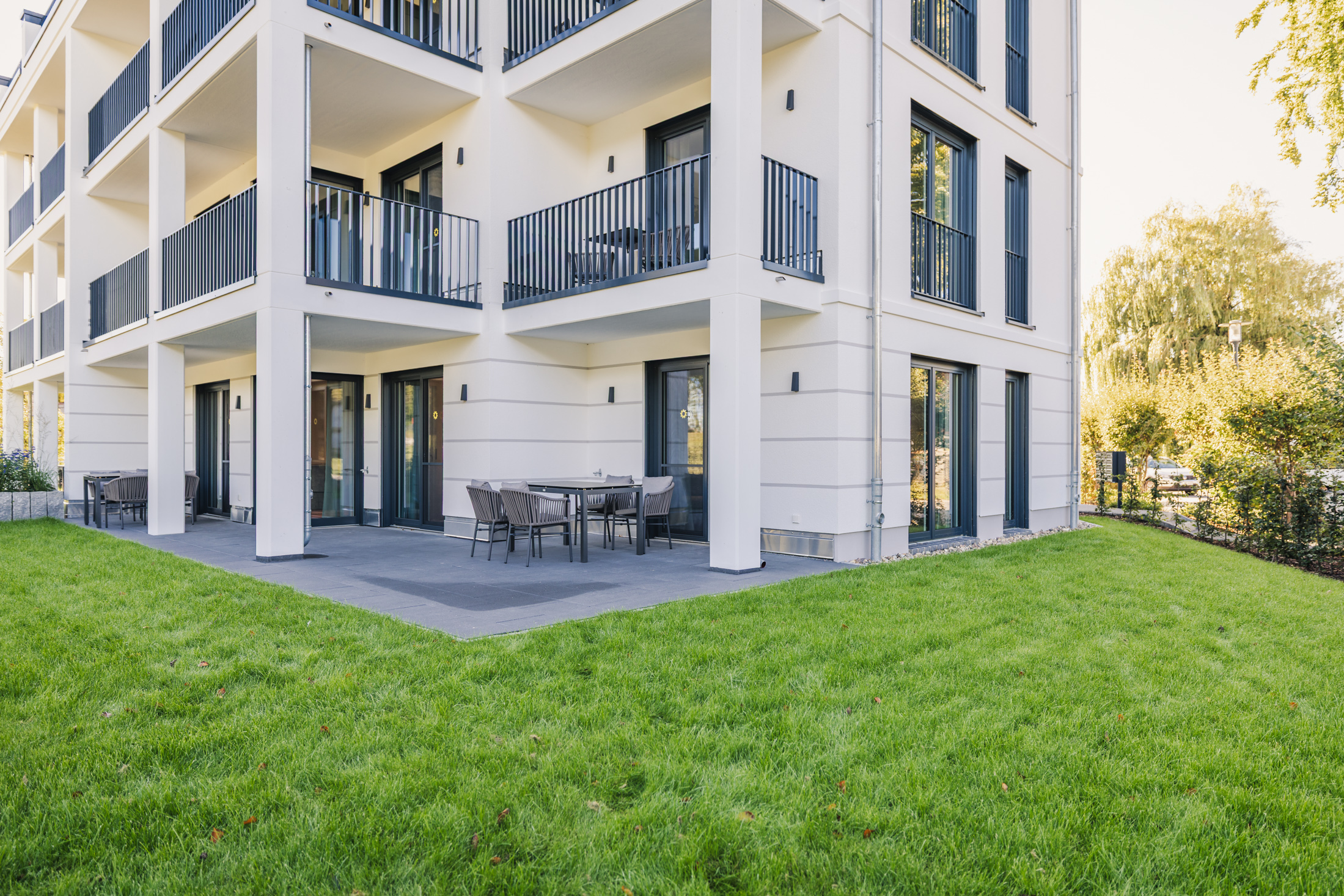 Die Außenanlagen wurden mit großer Sorgfalt und regionaltypischer Bepflanzung angelegt – harmonisch eingebettet in die Natur der Ostseeküste.